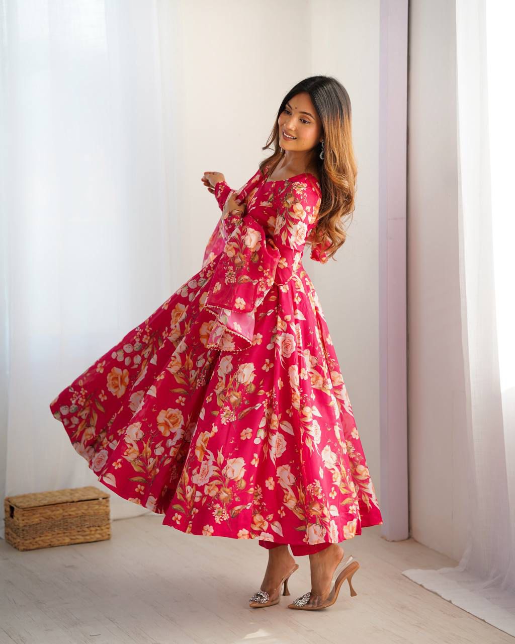 Nayu Fashions Fuchsia Pink Floral Taby Silk Anarkali Suit Set With Dupatta