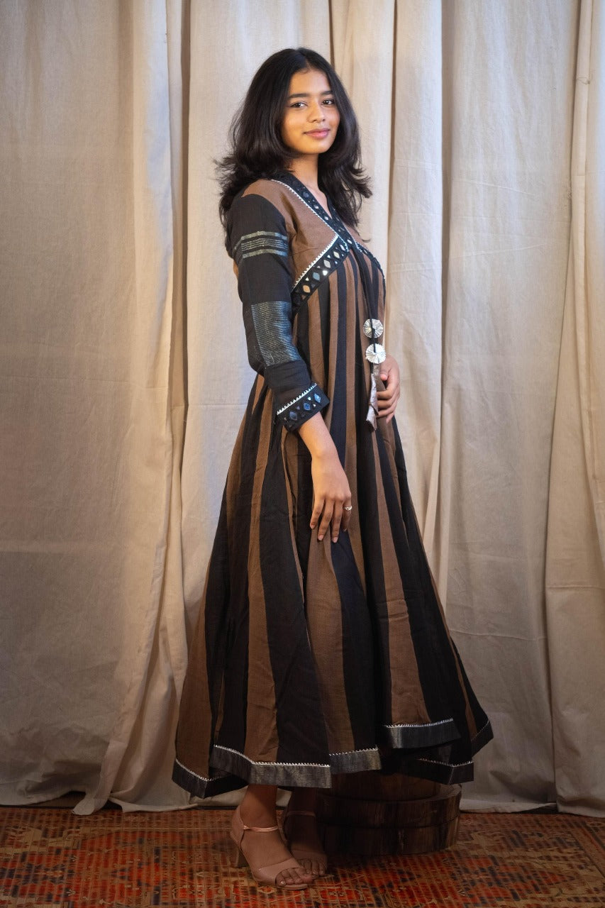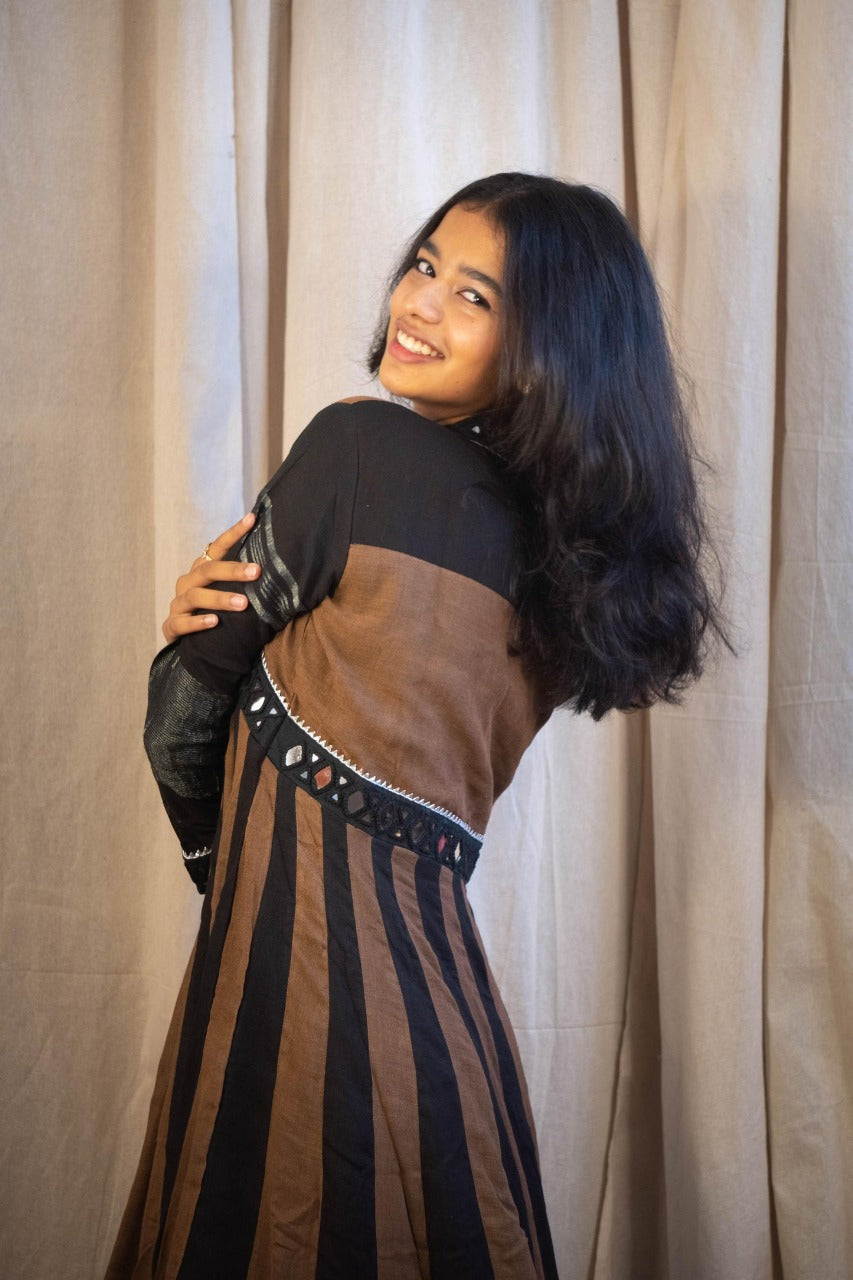 The rich black and brown color combination creates a bold, regal look, while the flared Anarkali silhouette adds movement and grace. A side pocket offers everyday practicality without compromising on style. Perfect for festive occasions, gatherings, or casual outings — this is where comfort meets couture.