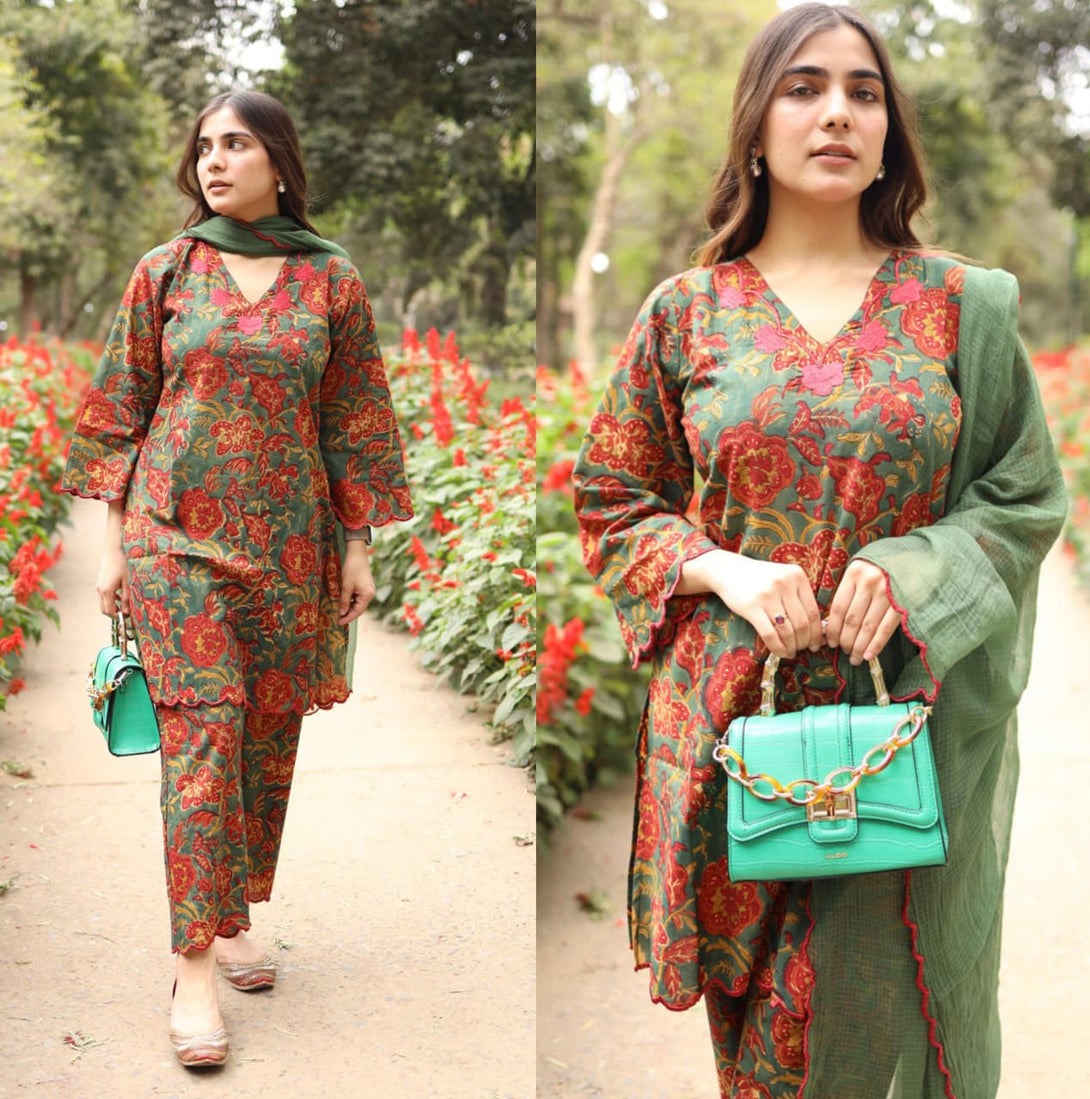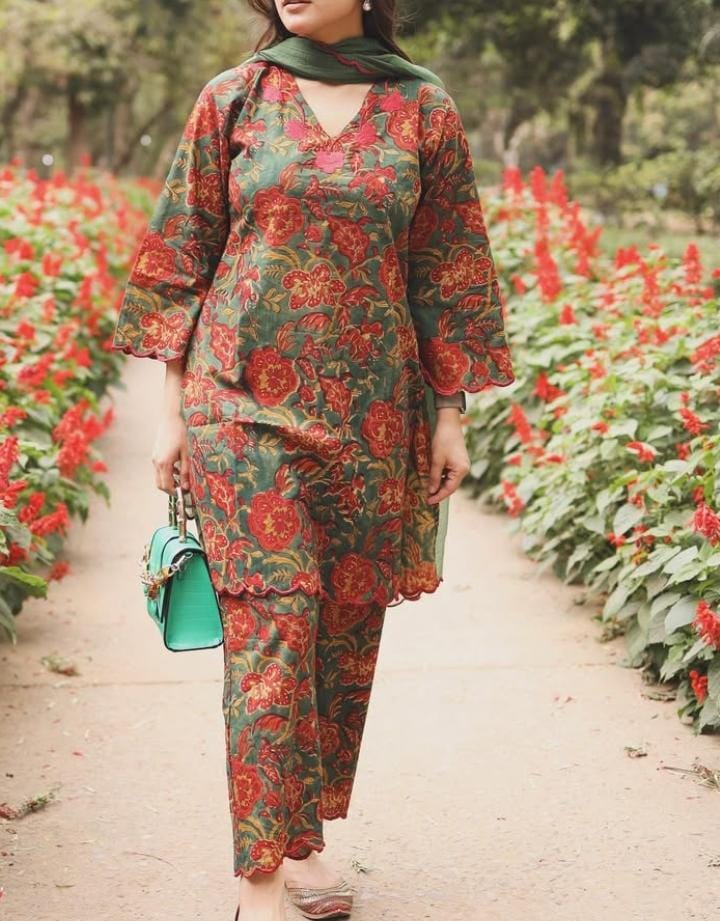 Add a refreshing touch of elegance to your wardrobe with Nayu Fashions’ Maria Green Contrast Co-ord Set. This beautiful ensemble is crafted from premium cotton fabric and paired with a Kota Doria dupatta, detailed with embroidered scallops for a graceful finish. The floral print in red and gold tones creates a rich, festive look, while the V-neckline and scalloped edges enhance its charm. Perfect for festive gatherings, daytime outings, or casual wear, this set blends sophistication with everyday comfort.