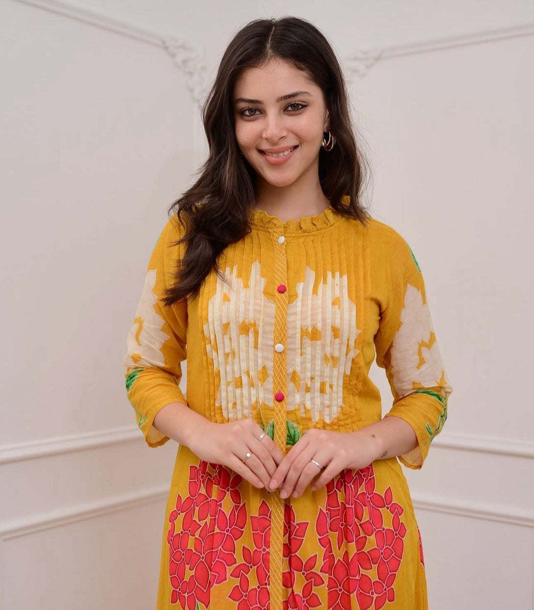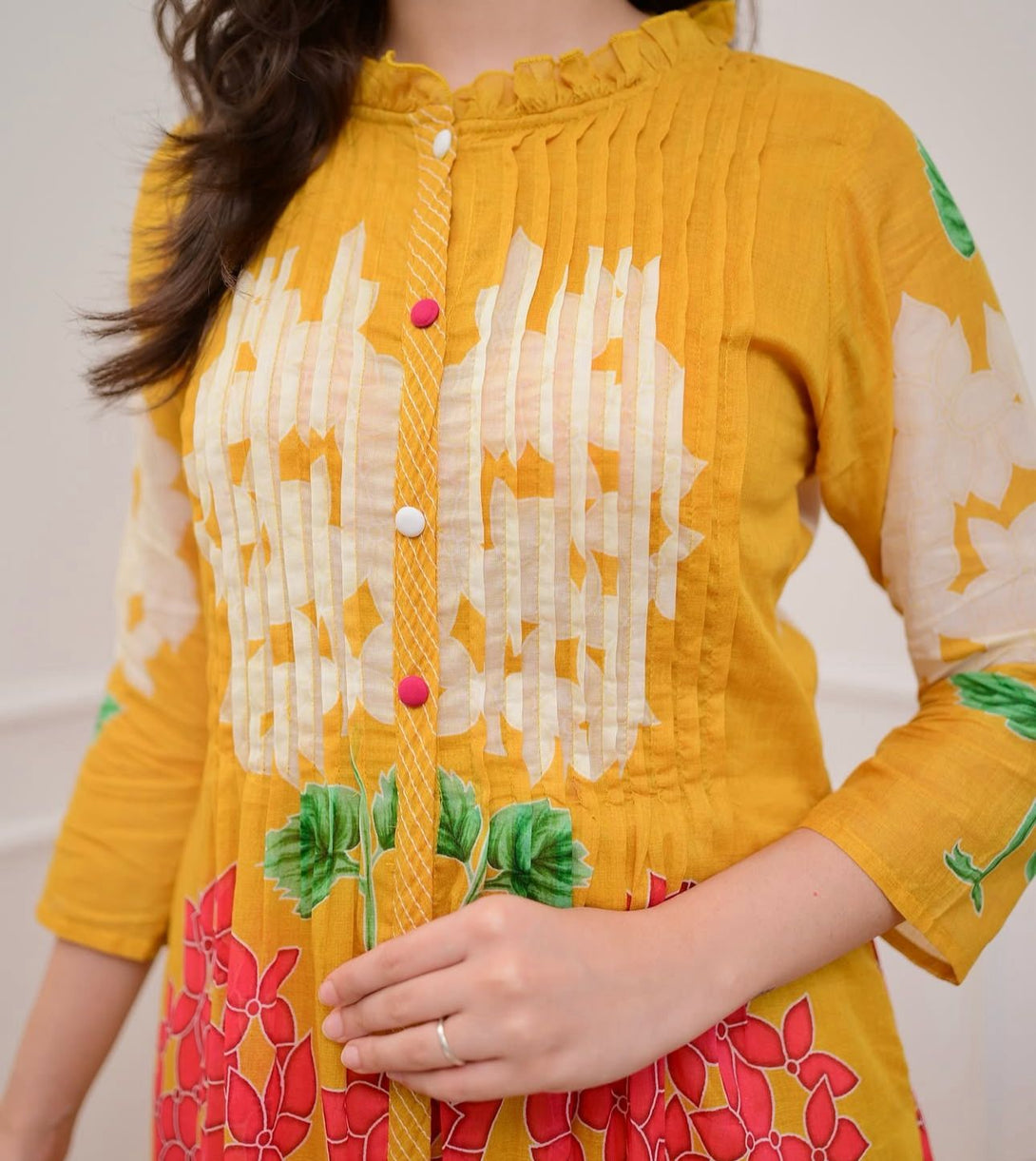 This mustard yellow mul cotton kurta set features intricate pintax detailing and katha embroidered floral work, giving it a perfect blend of ethnic beauty and modern simplicity. The attached full inner lining ensures softness and breathability for all-day wear.