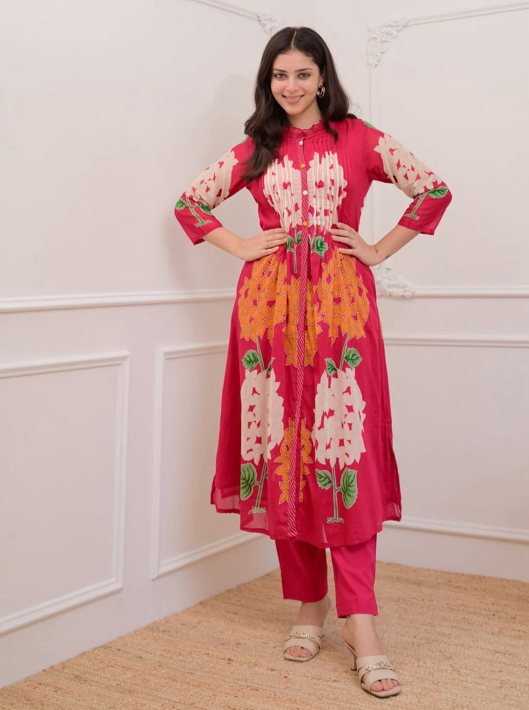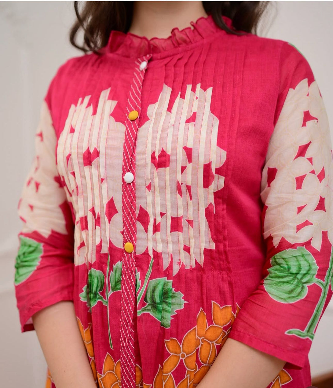 Introducing the Pink Blossom Mul Cotton Co-ord Set from Nayu Fashions — a vibrant must-have for the season. Crafted in breathable Mul Cotton fabric, this kurta set combines pintax detailing with delicate Katha embroidery to create a sophisticated yet playful design.