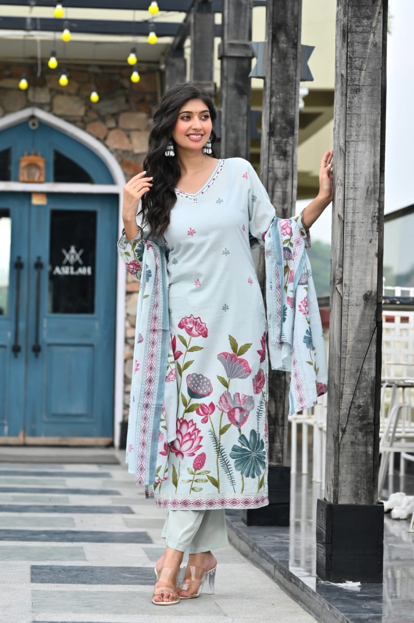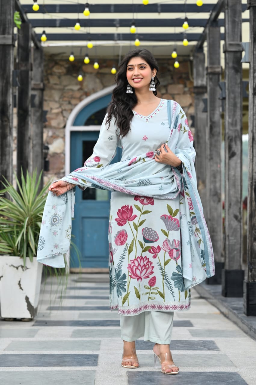 Elevate your ethnic wardrobe with this elegant Sky Blue Mal Cotton Suit Set from Nayu Fashions. Crafted from breathable pure mal cotton, this outfit features vibrant floral placement prints, a soft cotton dupatta, and real mirror hand work on the yoke for a festive touch. Designed for comfort and style, it’s the perfect pick for festive celebrations, parties, or casual ethnic outings.
