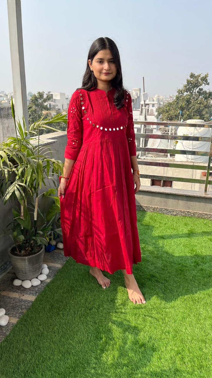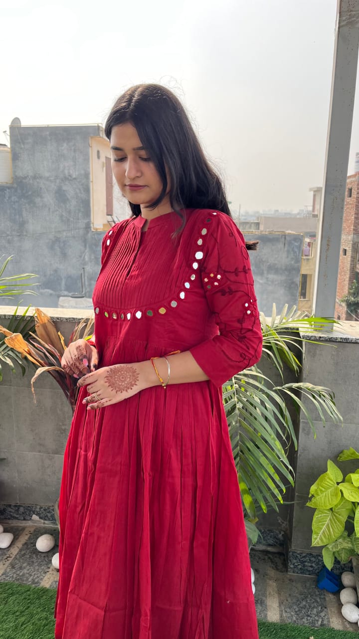 Nayu Fashions Women’s Red Cotton Mirror Work Gown | Embroidered & Pintex Long Dress