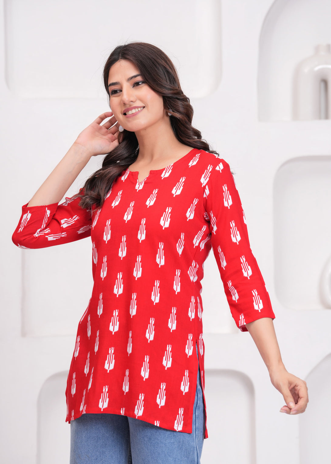 Elevate your everyday look with Nayu Fashions’ new trendy red printed top, crafted from premium heavy rayon fabric for a perfect mix of comfort and class. The elegant white print on a vibrant red base makes this top ideal for both office and casual outings.