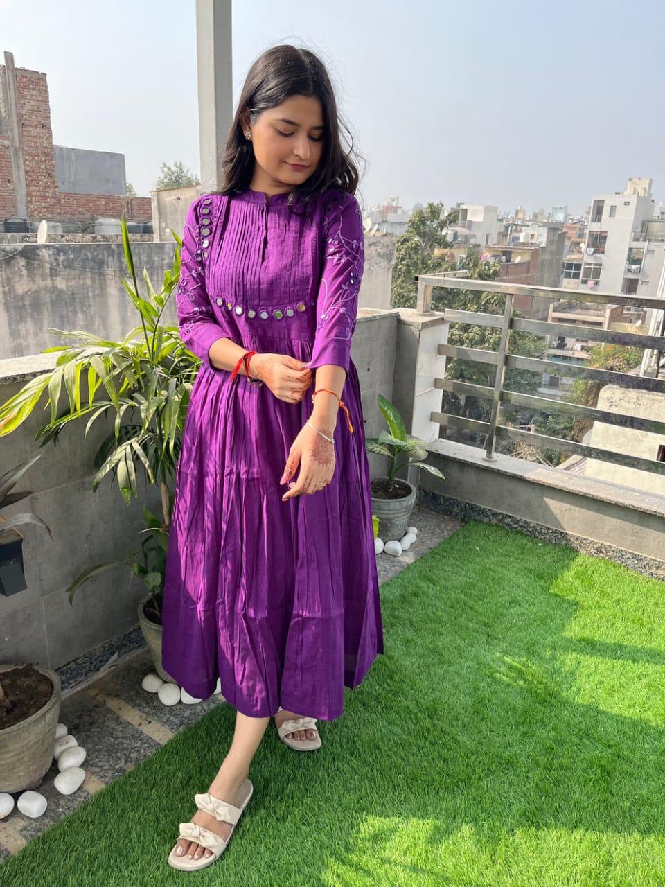 Nayu Fashions Women’s Violet Cotton Mirror Work Gown | Embroidered Pintex Long Dress